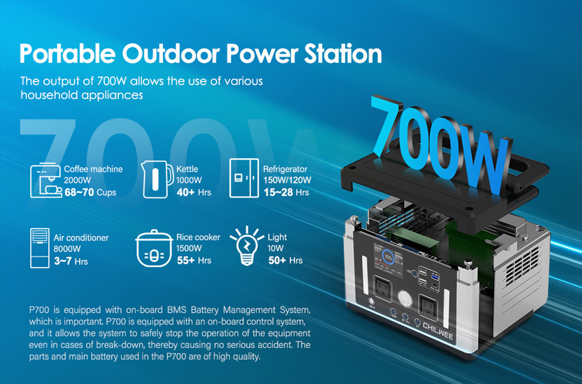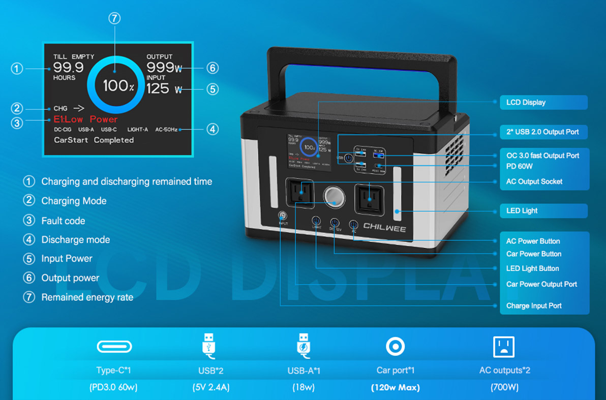 4. Mga Detalye ng Produkto ng 700W Smart Portable Power Station Para sa Pag-charge ng Pag-iilaw